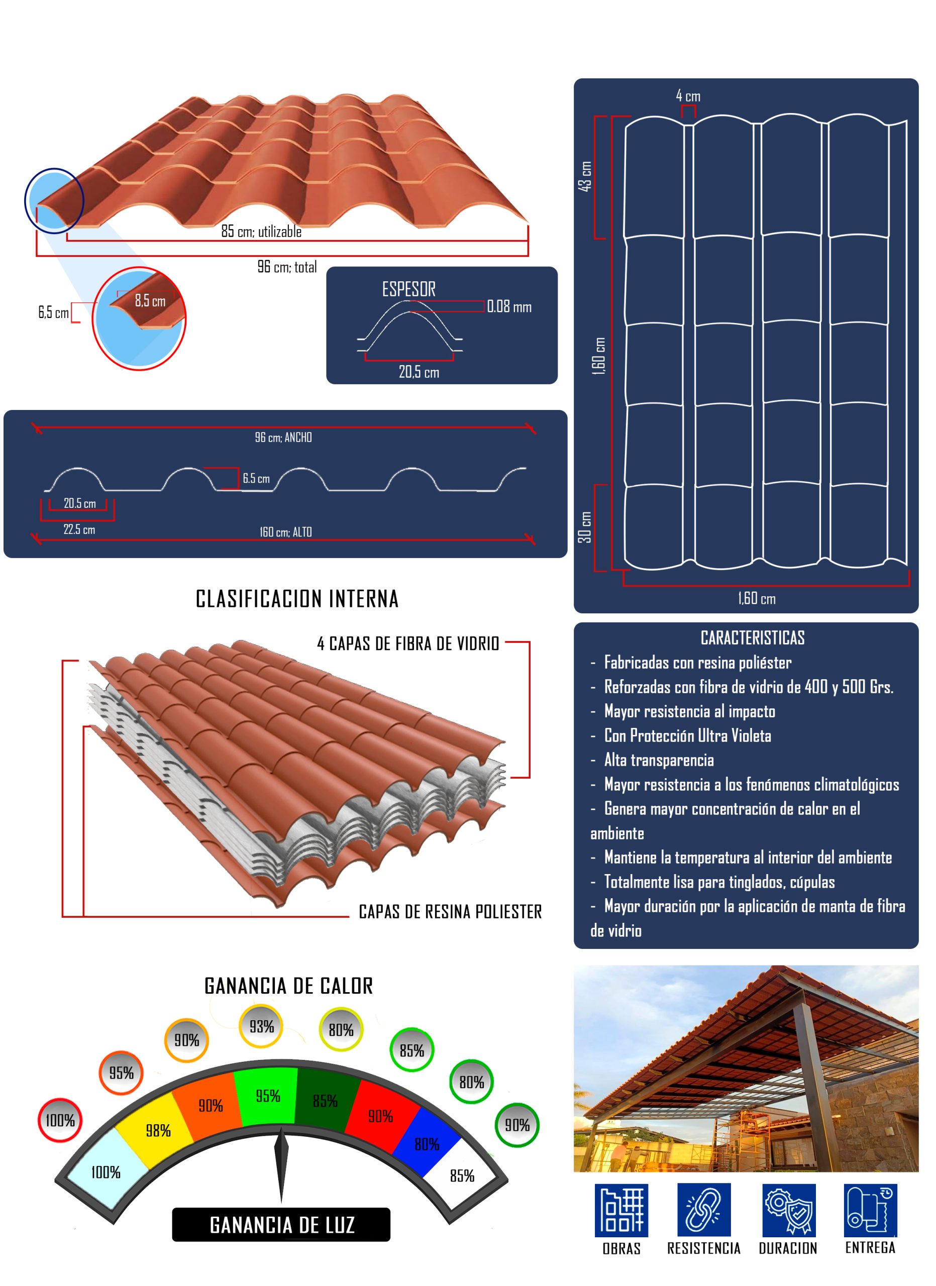 La calamina plástica de fibra de vidrio reforzada de 500 g tipo teja española combina diseño estético y tecnología avanzada. Fabricada con resina poliéster de alta resistencia y refuerzo de fibra de vidrio, ofrece una excelente durabilidad frente a la radiación UV, la humedad y los agentes químicos.