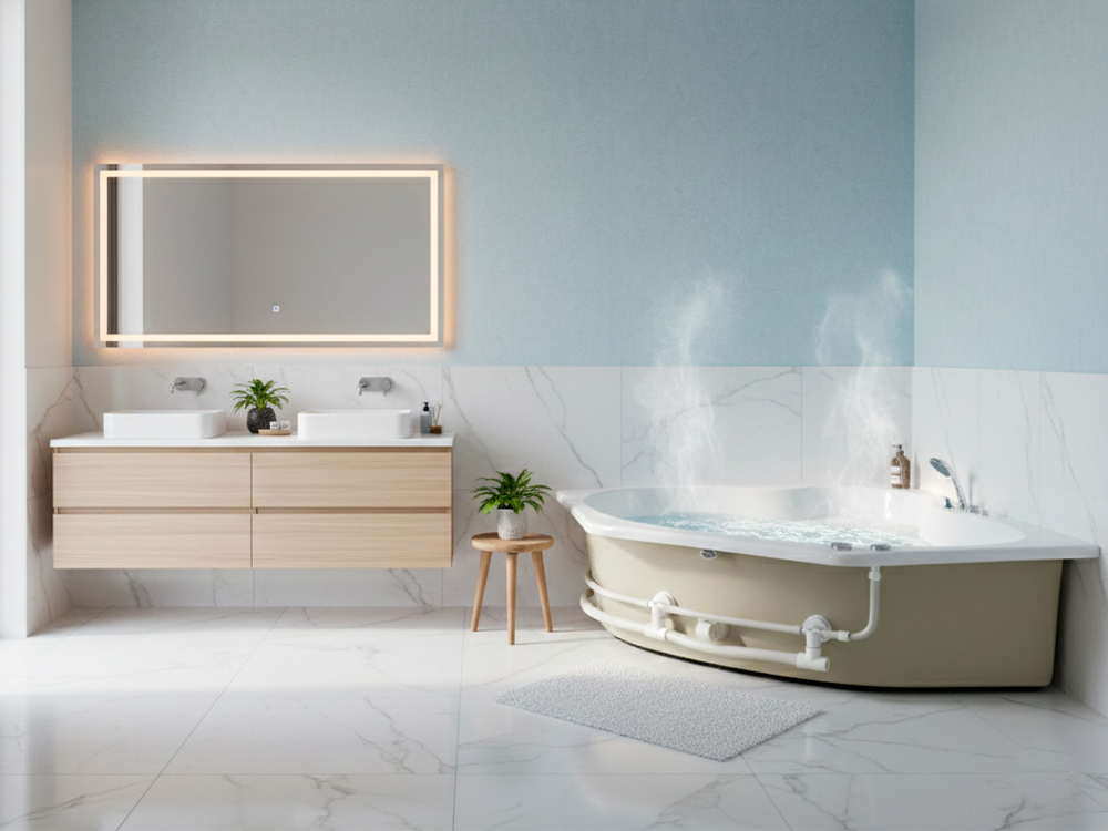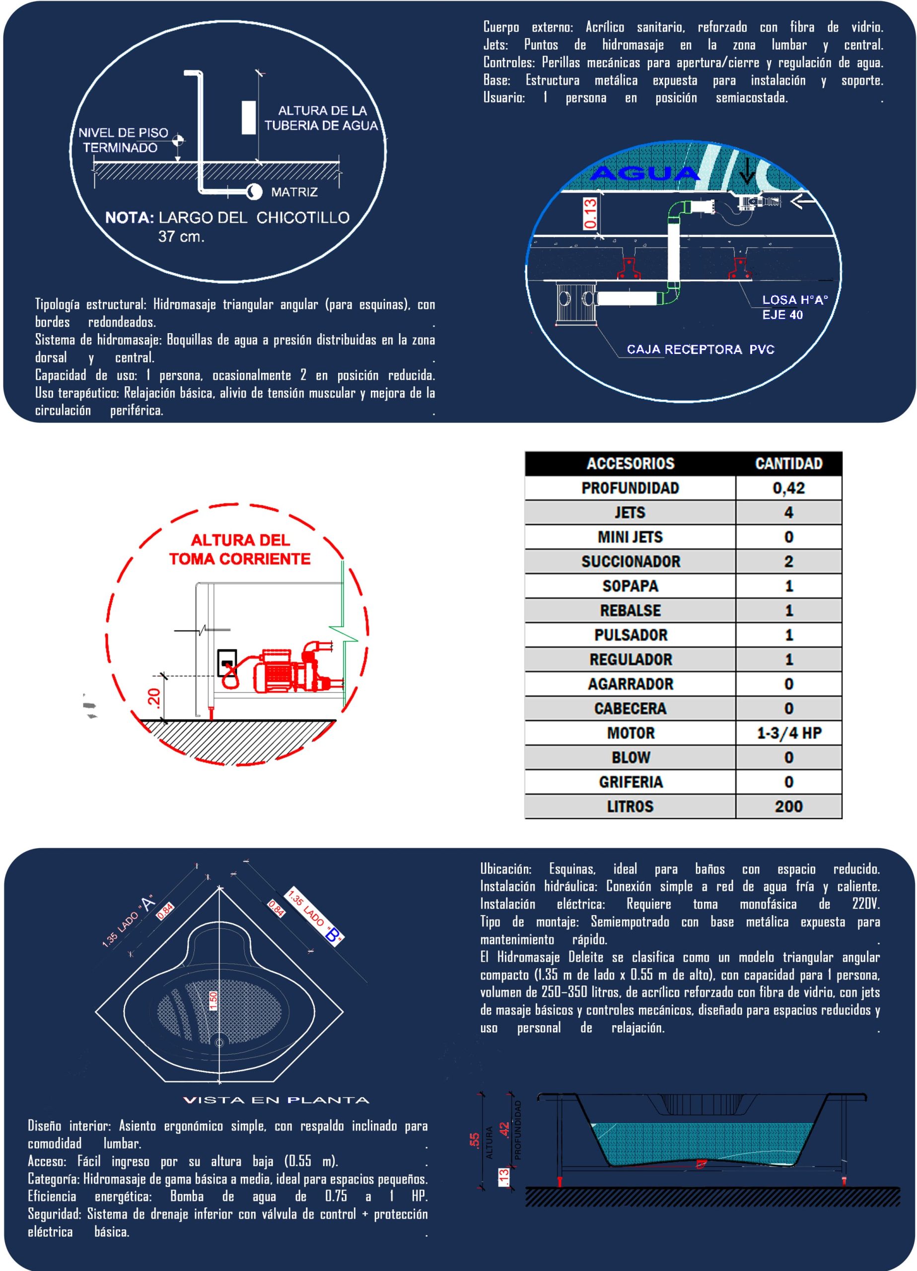 Sumérgete en un momento de puro placer y relajación con el hidromasaje Deleite, diseñado en fibra de vidrio de alta calidad para brindar resistencia y comodidad excepcionales. Sus chorros masajeadores ofrecen un suave y efectivo alivio de tensiones, ayudando a mejorar la circulación y renovar tu energía día a día.