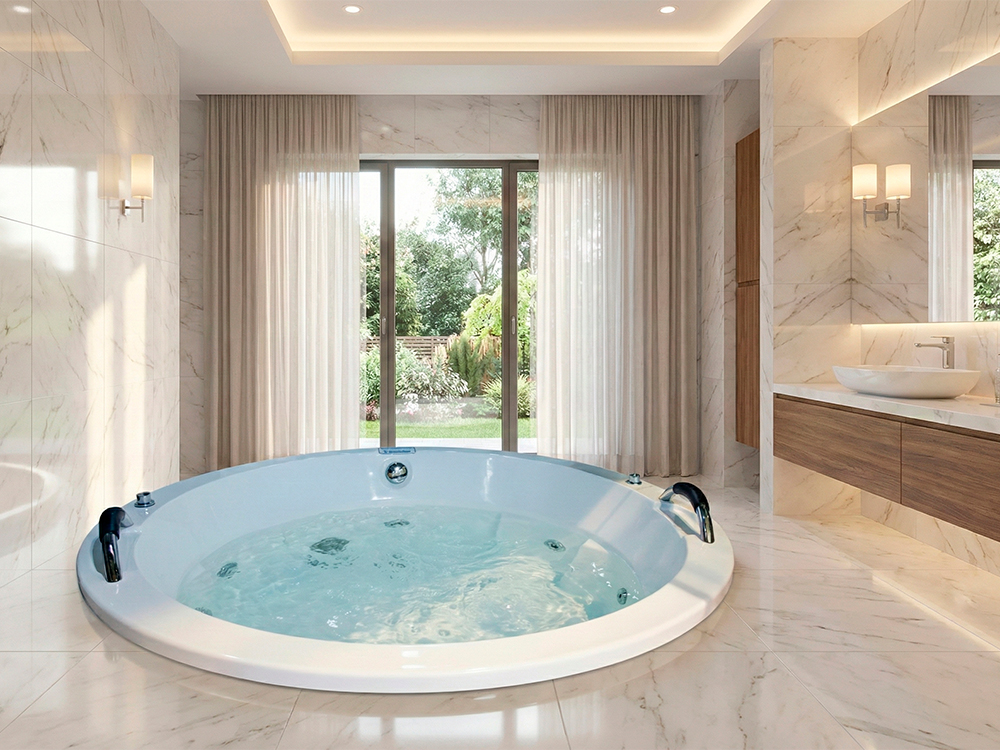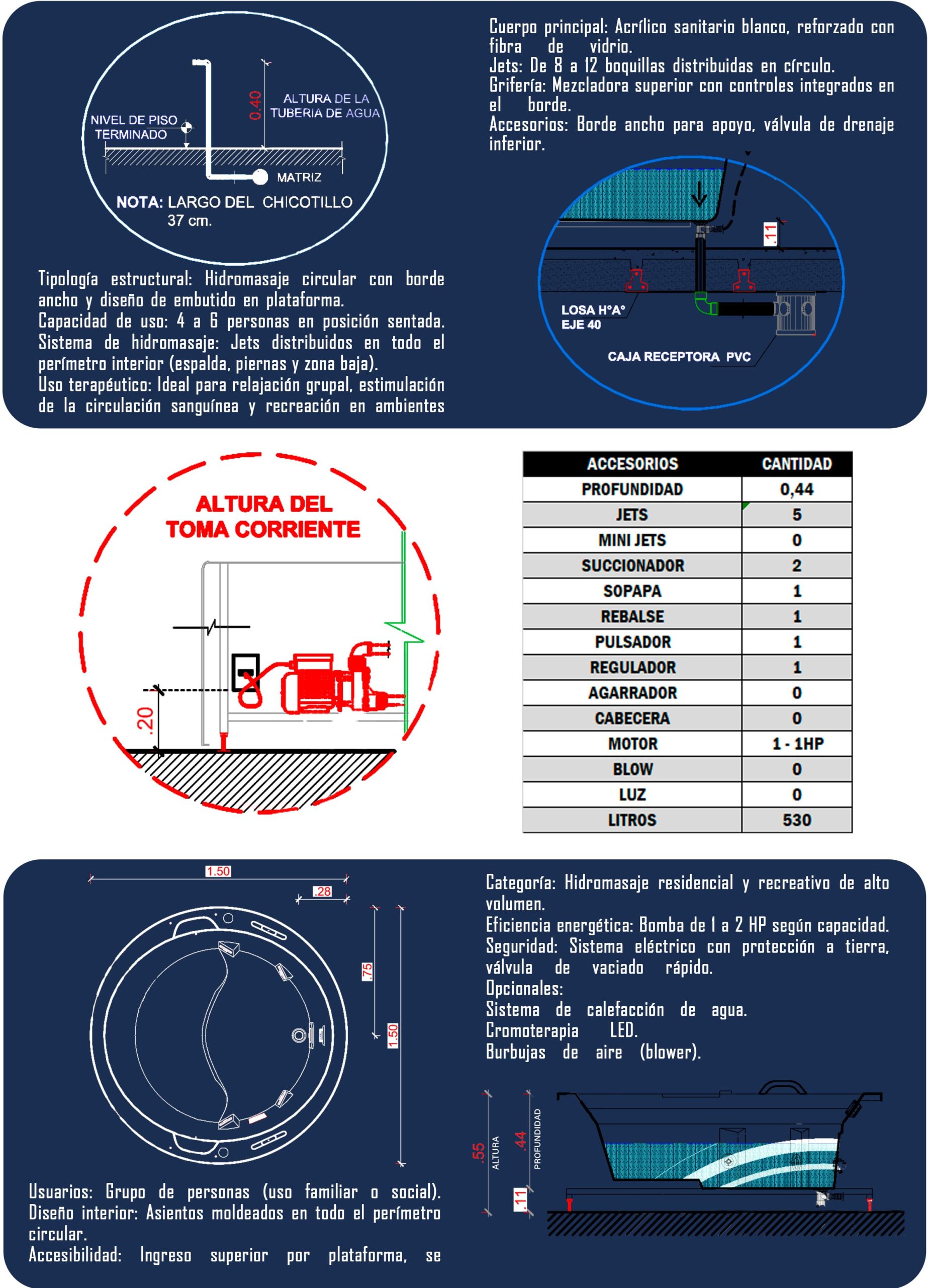 Diseñado para envolver tu cuerpo en una experiencia de relajación total. El hidromasaje Redondo, fabricado en fibra de vidrio de alta resistencia, ofrece un masaje uniforme y profundo gracias a sus chorros distribuidos de forma circular, brindando alivio a cada músculo de manera equilibrada y reconfortante.