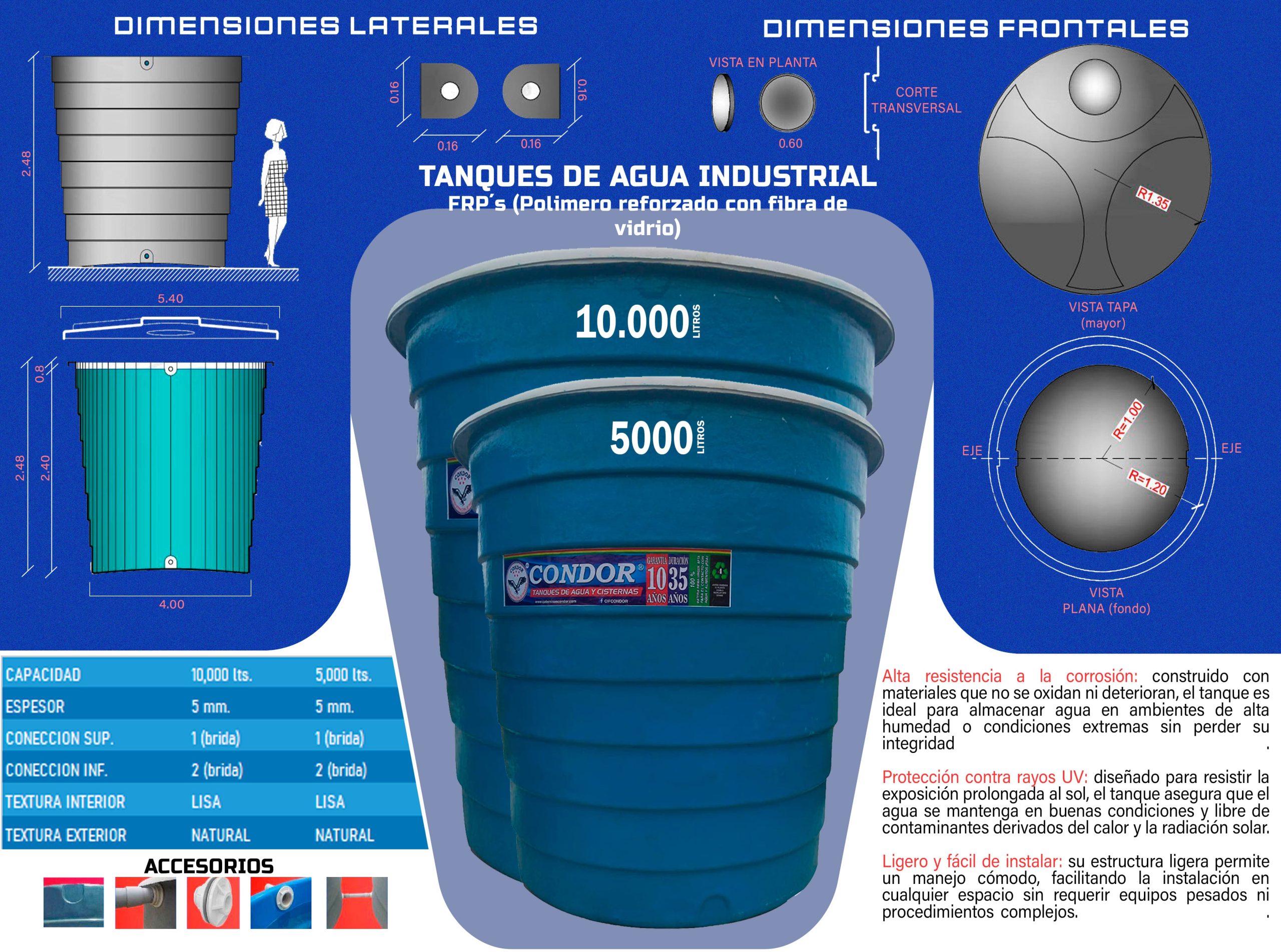Diseñado para grandes demandas de almacenamiento, este tanque de 10.000 litros está fabricado íntegramente en fibra de vidrio reforzada, garantizando máxima resistencia, estabilidad estructural y durabilidad a largo plazo. Su construcción anticorrosiva lo hace ideal para uso en industrias, centros agrícolas, complejos habitacionales e instituciones que requieren un suministro masivo y constante de agua. Gracias a su superficie lisa y no porosa, mantiene la calidad del agua en óptimas condiciones, evitando contaminación y sedimentos. A pesar de su gran capacidad, es ligero para trasladar y sencillo de instalar, ofreciendo una solución confiable, segura y de alto rendimiento para proyectos que exigen almacenamiento robusto y eficiente.
